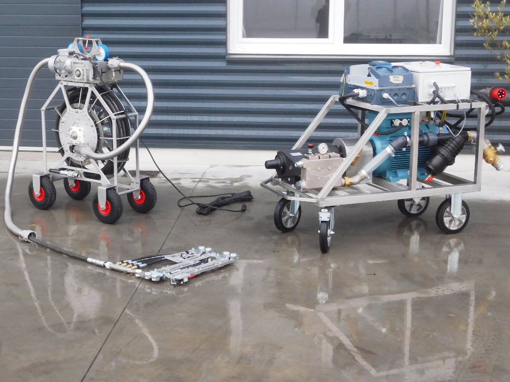 AX Cleaner = 1 groupe motopompe haute puissance + 1 pusher + 1 système d’échelles + 1 ensemble de buses de nettoyage haute pression = 1 ensemble complet ACC cleaning. Le groupe motopompe produit de l’eau à très haute pression et va alimenter l’ensemble de votre installation de nettoyage. Le pusher est alimenté par le groupe motopompe et permet de positionner précisément le tuyau souple qui va alimenter les têtes de nettoyage sur toute la hauteur de vos aéroréfrigérants, sans risque d’emmêlement de tuyaux. Le système est conçu pour être manœuvré par un opérateur unique. Une échelle accueille l’ensemble des têtes de nettoyage et en permet le mouvement au plus près de la zone à nettoyer. Dans la solution présentée, on distingue bien l’ensemble des têtes de lavage, l’échelle, le pusher. Le groupe motopompe est déporté en contrebas de l’aéroréfrigérant et donc absent de l’illustration.