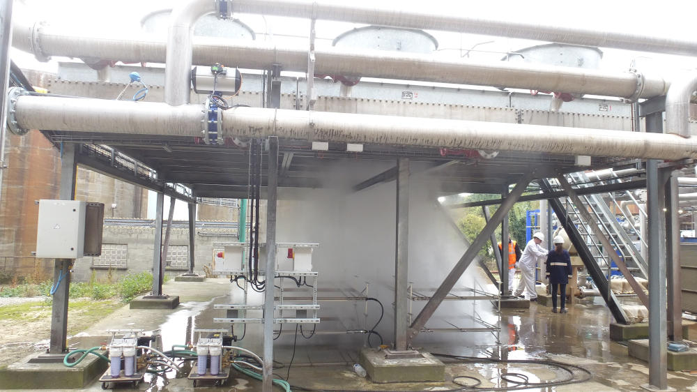 Par exemple, pour un ACC, 100 modules peuvent être installés, pulvérisation, 540 L/min et permettent de diminuer la température du flux d’air jusqu’à 6°C, en fonction de conditions météorologiques (température et humidité relative).