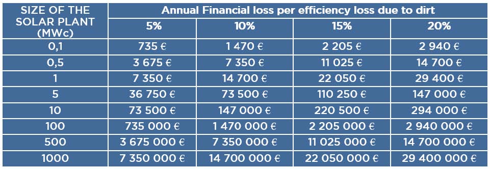 En fonction de l’environnement naturel autour de la centrale solaire, nous estimons que sans nettoyage, l’efficacité chute de 2 à 15% par mois.